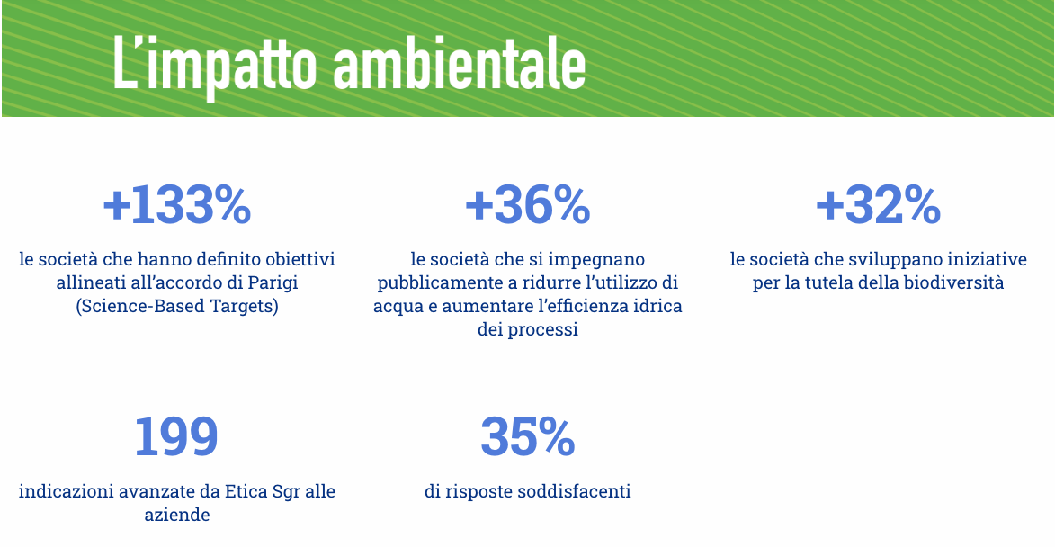 Nel 2020 il dialogo con le aziende di Etica Sgr per quanto riguarda l’impatto ambientale si è concentrato in particolare sui seguenti temi: