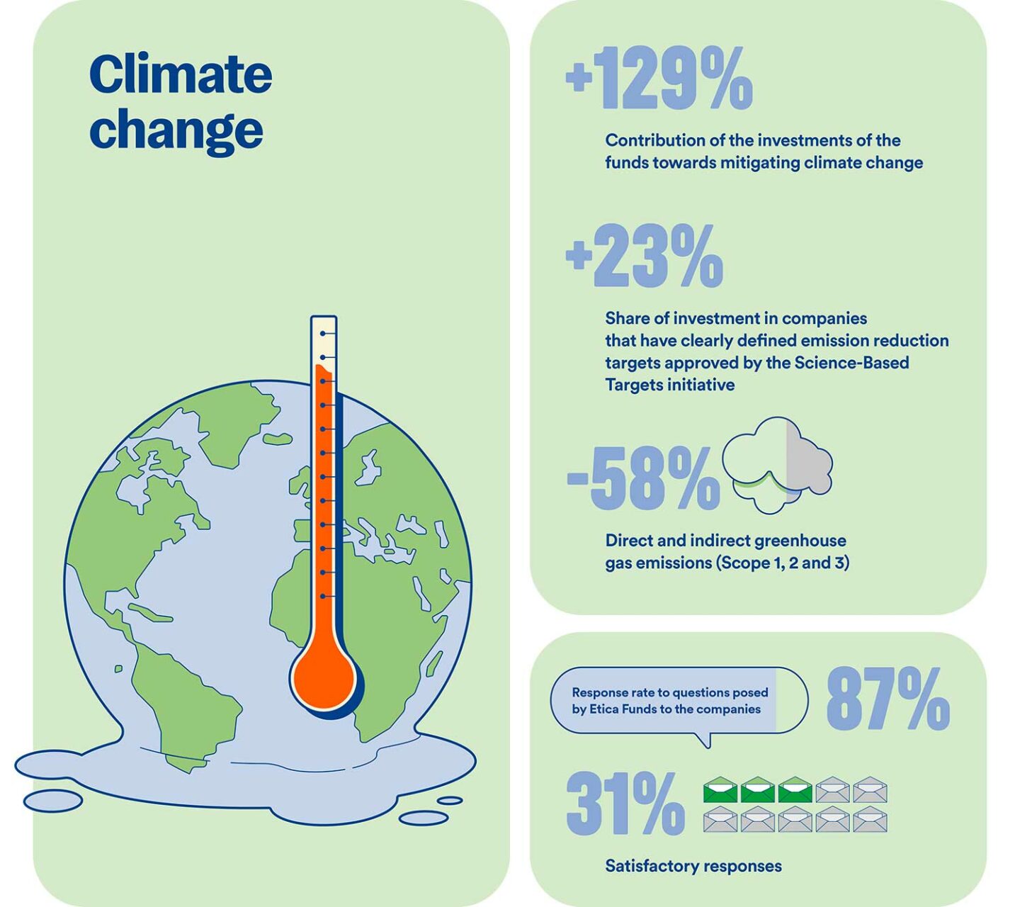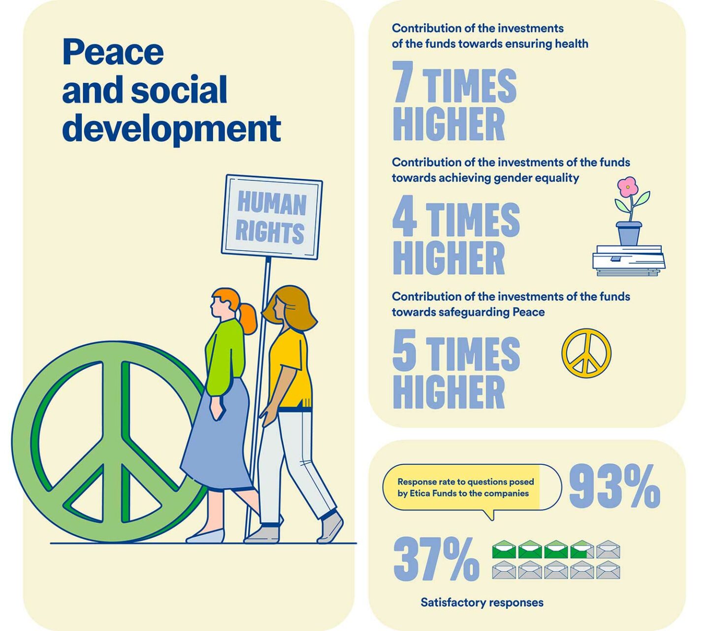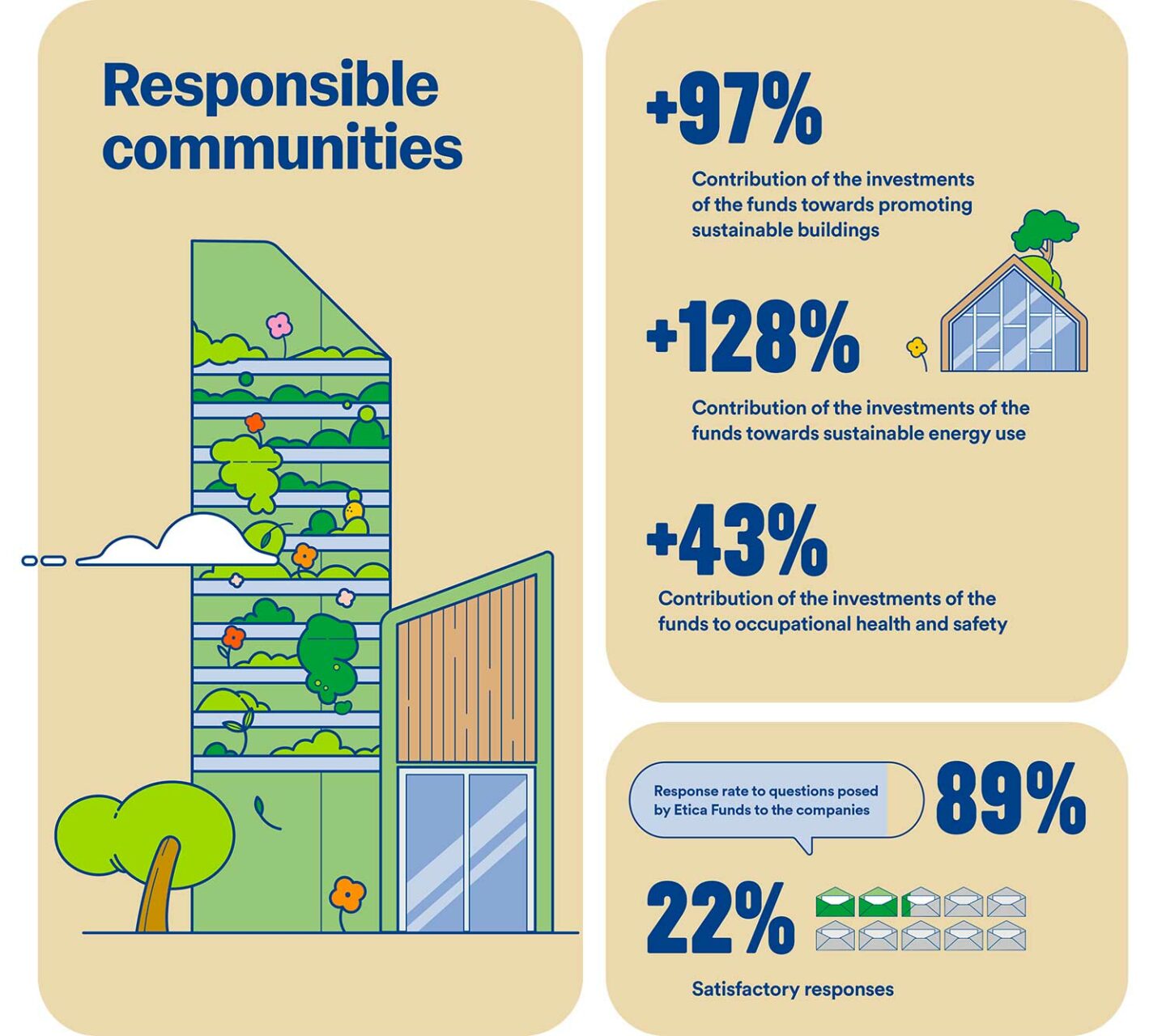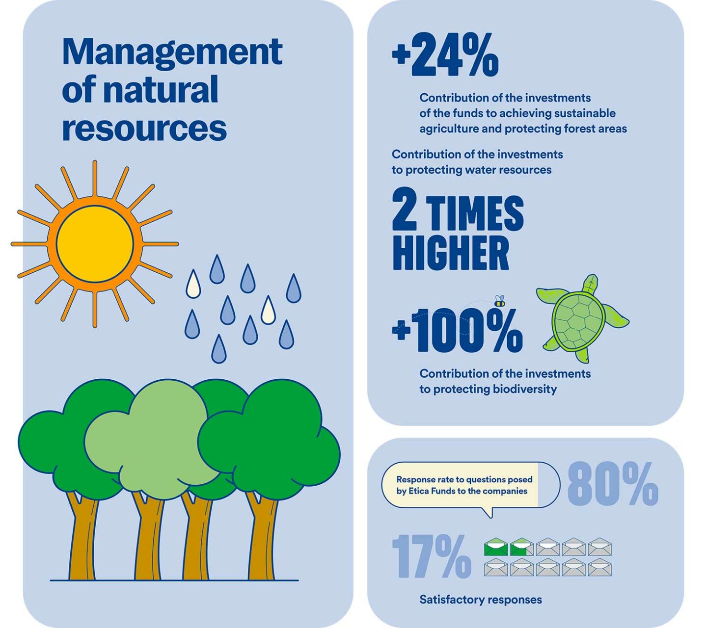 The impact generated by investments in the mutual funds managed by Etica Funds is based on two strategic levers: the selection of securities based on ESG criteria, implemented through the proprietary ESG methodology EticApproach®, and continuous stewardship. Thanks to our selection activity, for 25 years our funds have exclusively invested in businesses and countries characterised by their commitment to environmental, social and governance issues. This selection process is further supported by stewardship with the corporate bodies of the companies in the portfolio, including activities such as consistent dialogue and the exercise of voting rights, aimed at promoting increasingly responsible practices.