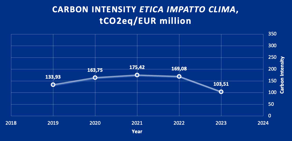 Based on the carbon footprint analyses performed over time, in 2021, the selection methodology has been amended to improve the carbon footprint of the funds, by introducing specific criteria to evaluate companies involved in natural gas activities and companies in high carbon-intensity sectors. During 2022 a specific climate assessment was included in the methodology to further enhance Etica’s selection approach. The effects of such changes are fully applied to the portfolios by March 2023.