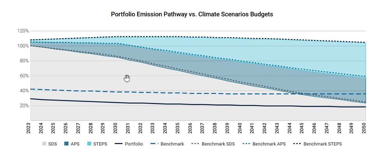 The fund outperforms the market, proxied by the index MSCI World ESG Universal Net Total Return, which exceeds the budget of the SDS scenario already in 2026 and is associated with a temperature increase of 2.6°C by 2050.