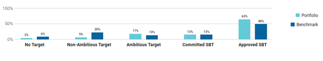 Compared to last year’s analysis of the portfolio at the end of 2022, there’s a 4.5% increase in the number of companies committed to international climate targets and a 14.5% increase in the number of companies covered by an SBTi approved target.