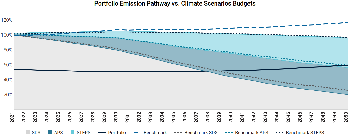 The portfolio is aligned with the Sustainable Development Scenario until 2038 and is associated with a potential temperature increase of 2.1°C by 2050. This result shows that there is still room to improve the fund’s carbon footprint to align with a below-two- degrees-world. However, the fund outperforms the market, here proxied by the index MSCI World Net Total Return and referred to as “benchmark”, which exceeds the budget of the SDS scenario already in 2022 and is associated with a temperature increase of 2.8°C by 2050.
