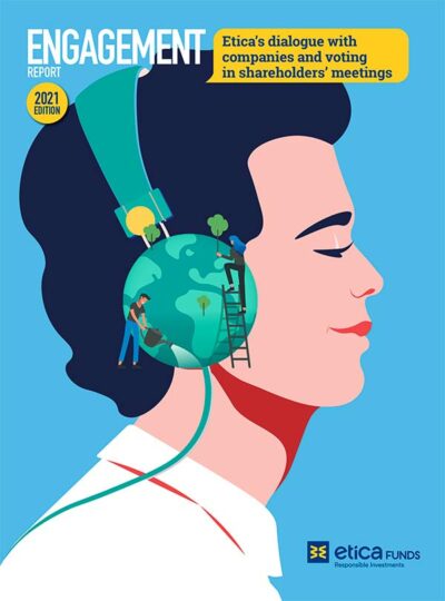 Engagement Report 2021 is the name of the document which analyses the results achieved through our dialogue with the management and voting at shareholder meetings of companies in which Etica Funds invests.