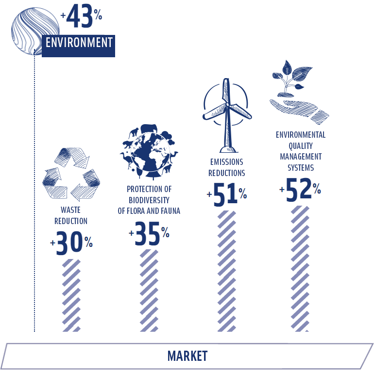1The data refer to the number of companies in which the Etica Azionario fund invests which are committed to ESG issues on each of the indicators represented (waste reduction, protection of biodiversity, emissions reductions, environmental quality management systems). The composite ESG indicators, on the other hand, take into account all aspects covered by the analysis (e.g. for “environment” the calculation is not limited only to waste reduction, protection of biodiversity, emissions reductions, and environmental quality management systems). The data are expressed as a % of the market benchmark, (iShares MSCI ACWI ETF). For more details, see Methodology.