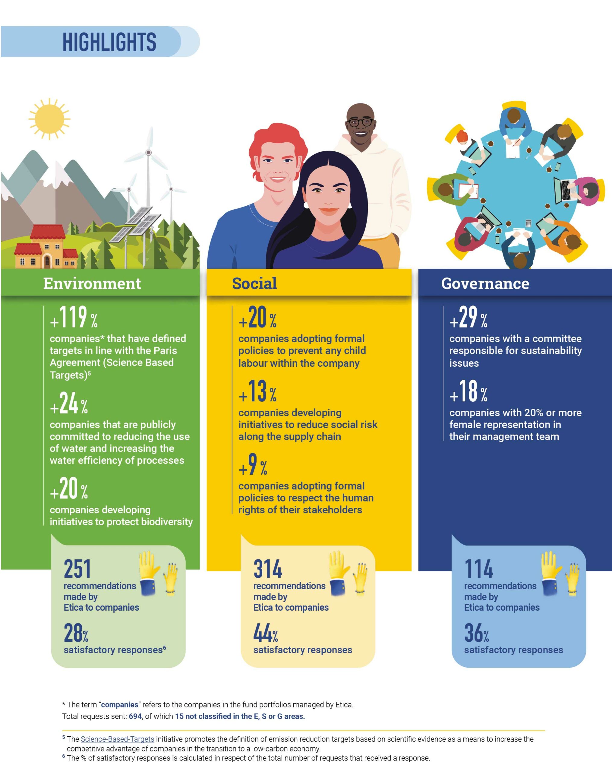 The Impact Report, now in its fifth edition, is Etica FUNDS’s tool for measuring the impact of securities selection (compared with the benchmark1) and its engagement activities, in particular the dialogue with the companies in which our funds invest.