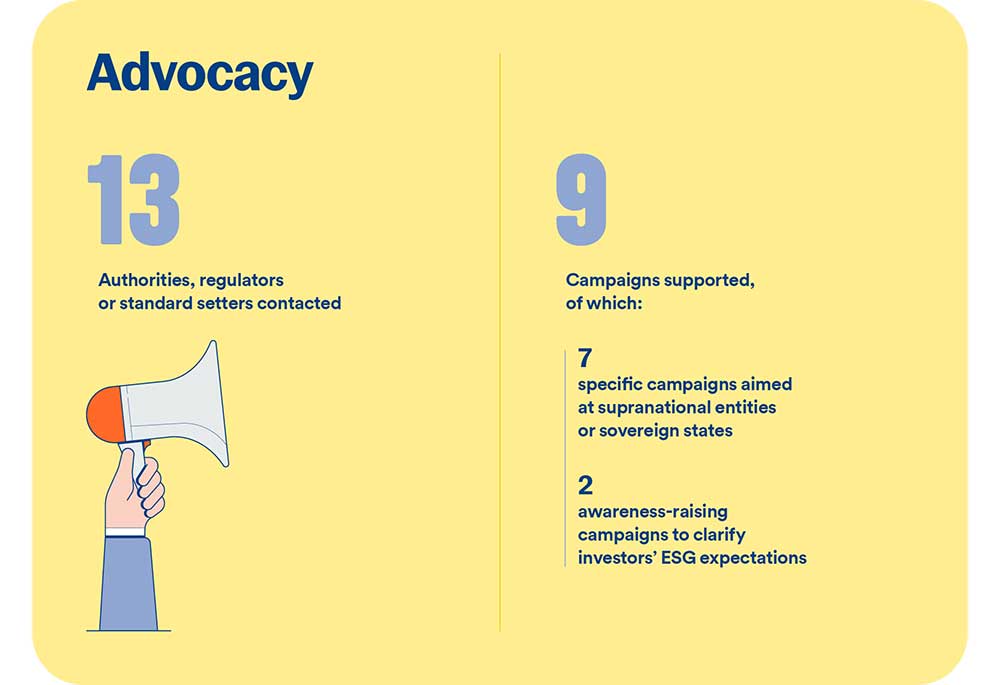 We carried out additional biodiversity- related activities, reinforcing the partnership with the CDP Forest Champions programme. This led Etica to be included in the list of international best practices in the Nature Positive for Climate Action publication by the UNFCCC. Encouraged by the feedback following our participation in the PRI Tax Reference Group, we structured a dialogue campaign on taxation, which allowed us to identify the highest-risk companies by the end of the year. We recently launched a campaign on the responsible use of artificial intelligence, signing an Investor Statement on Ethical AI and taking part in the Collective Impact Coalition for Ethical AI.
