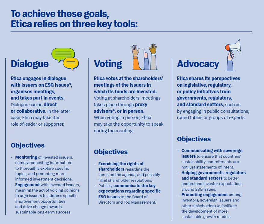 Stewardship Report 2025 is the name of the document that analyzes the results of the dialogue with management, of the active shareholding carried out with the companies in which Etica’s funds invest and of the advocacy activity carried out with governments, regulators and standard setters.