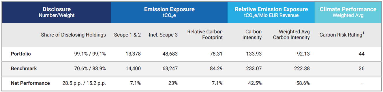 Calcula el % de número y el % de ponderación de las compañías que comunican emisiones fiables en la cartera y la referencia, respectivamente. El rendimiento neto se calcula en puntos porcentuales.