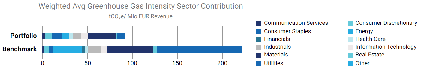 La exposición a las emisiones de alcance 1 y 2 y la huella de carbono relativa de la cartera (tCO2e/millón de euros invertido) son menores que el valor de referencia, debido a una menor asignación al sector Energy y una menor selección de valores intensos en carbono en Utilities.