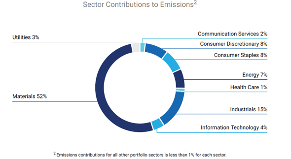 La Figura 2 aporta más información sobre la WACI. En primer lugar, en términos de contribución sectorial, el sector Materials, generalmente intenso en carbono, es el mayor contribuidor a la WACI de la cartera. La contribución de otro sector intensivo en GEI, como Utilities, es mucho menor que en la referencia. Esto resalta la manera en que la selección de las acciones de la cartera favorece los Utilities con menor intensidad en carbono en comparación con la referencia. Además, el hecho de que la cartera tenga una asignación de activos más limitada para el sector Energy, en comparación con la referencia, contribuye positivamente a la WACI de la cartera en relación con la referencia.