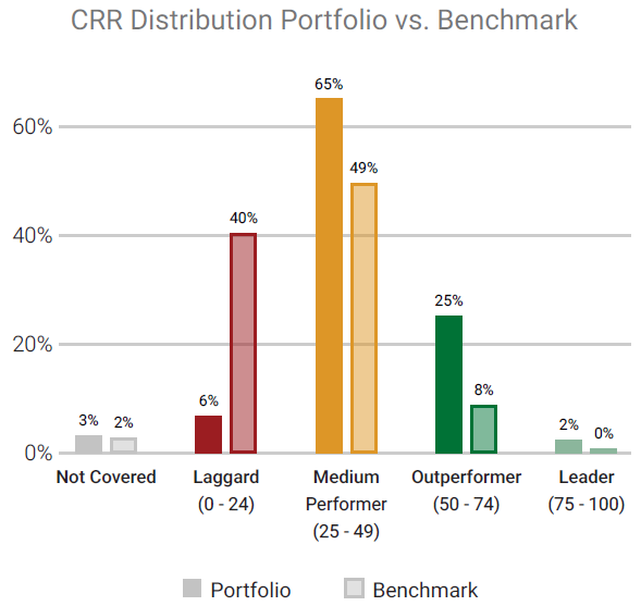 La CRR media de los emisores de la cartera generalmente tiende a encontrarse en el extremo superior (alto rendimiento, líderes) de la CRR específica de la industria repartida entre todos los emisores del universo cubierto por la CRR. Lo que antecede es especialmente significativo para industrias claves, como las de energías renovables (operaciones) y equipos y servicios con eficiencia energética.