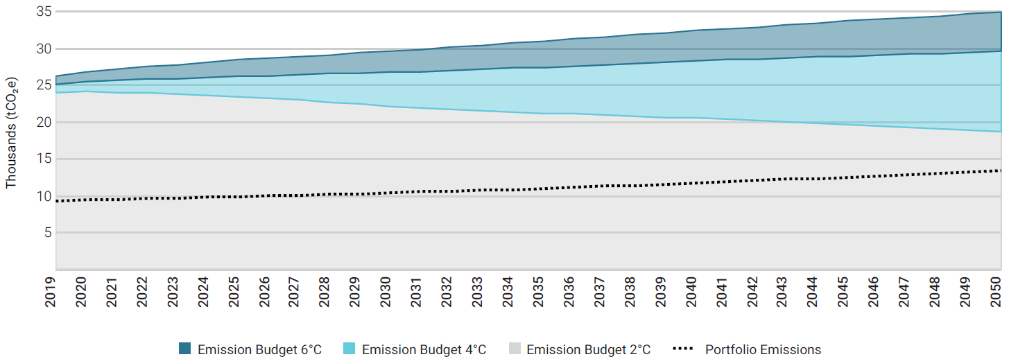 Para que una compañía específica esté en línea con los escenarios climáticos de 2 °C, 4 °C y 6 °C, el presupuesto de carbono asignado por año tiene que ser mayor que las emisiones directas estimadas para dicha compañía. Las emisiones y el presupuesto de carbono a nivel de la compañía son luego agregados para obtener un alineamiento de la cartera con los escenarios de 2 °C, 4 °C y 6 °C.