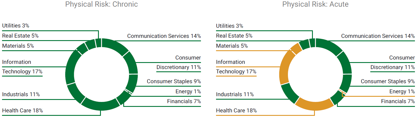 Los dos gráficos de anillos suman la ponderación en la cartera por sector GICS. Los colores de las secciones indican la puntuación agregada de riesgo físico del sector de las compañías de la referencia, de conformidad con la siguiente lógica: