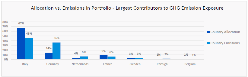Para la cartera de deuda soberana del fondo Etica Impatto Clima, la intensidad de emisiones por unidad de deuda de Italia es una de las más bajas y esto reduce la exposición a emisiones y la correspondiente huella de carbono. Por otro lado, una presencia mucho menor de Francia en la asignación de capital de la cartera en comparación con la referencia, así como la ausencia de otros países de baja intensidad, como España (no presente en la cartera, a pesar de tener una ponderación del 14 % en la referencia), explica la WACI superior de la cartera.