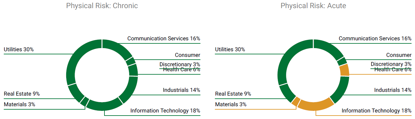 Figura 10: Esposizione ai rischi fisici legati al clima del Portafoglio delle obbligazioni societarie della Linea Valori Responsabili (verde: rischio basso; arancio: rischio medio; rosso: rischio elevato)