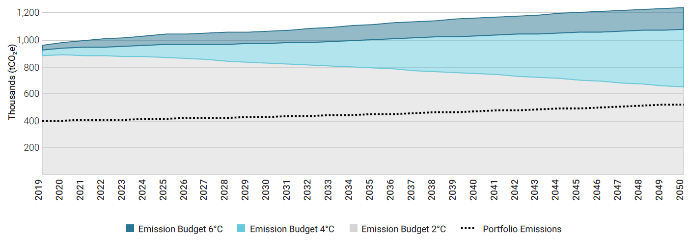 For a specific company to be in line with either the 2°C, 4°C and 6°C climate scenario, the allocated carbon budget per year need to be higher than the estimated direct emissions for the same company. The emissions and carbon budget at the company-level are then aggregated to get a Portfolio 2°C, 4°C and 6°C scenario alignment.
