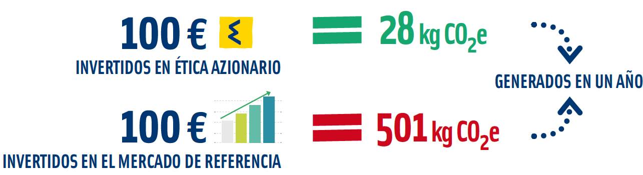 Del análisis, realizado en base a las mediciones de CDP (anteriormente Carbon Disclosure Project), se desprende que 100 euros invertidos en Etica Azionario generan 28 kg de CO2e en un año, frente a los 501 kg de CO2e que la misma inversión genera en el mercado de referencia (mercado mundial de renta variable)*.