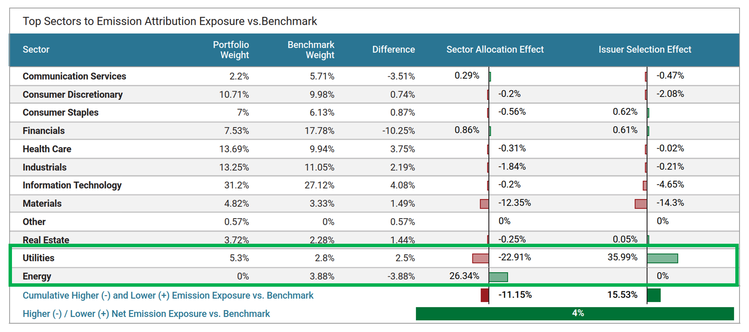 Se si analizza l’allocazione delle emissioni, l’impatto della decisione di Etica diventa ancora più chiaro. La tabella seguente mostra i settori con le emissioni più elevate all’interno del portafoglio combinato (Etica + Benchmark) e compara ciascun emittente in ciascun settore tra il portafoglio e il benchmark valutando gli effetti dell’allocazione settoriale e della selezione degli emittenti. Un valore positivo (verde) del 4% indica che l’emittente ha una minore esposizione ai gas serra nel portafoglio rispetto al benchmark. Difatti, un portafoglio con una percentuale maggiore di attività allocate in un settore ad alta intensità di emissioni avrà in definitiva una maggiore esposizione alle emissioni di gas serra. Tuttavia, ciò può essere compensato dalla selezione di emittenti ad alta intensità di emissioni di quel settore. In particolare, la scelta metodologica di non investire nel settore energetico e di applicare valutazioni climatiche rigorose alle società che operano nel settore dei combustibili fossili (principalmente nel settore delle utilities) consente di ottenere questi risultati.