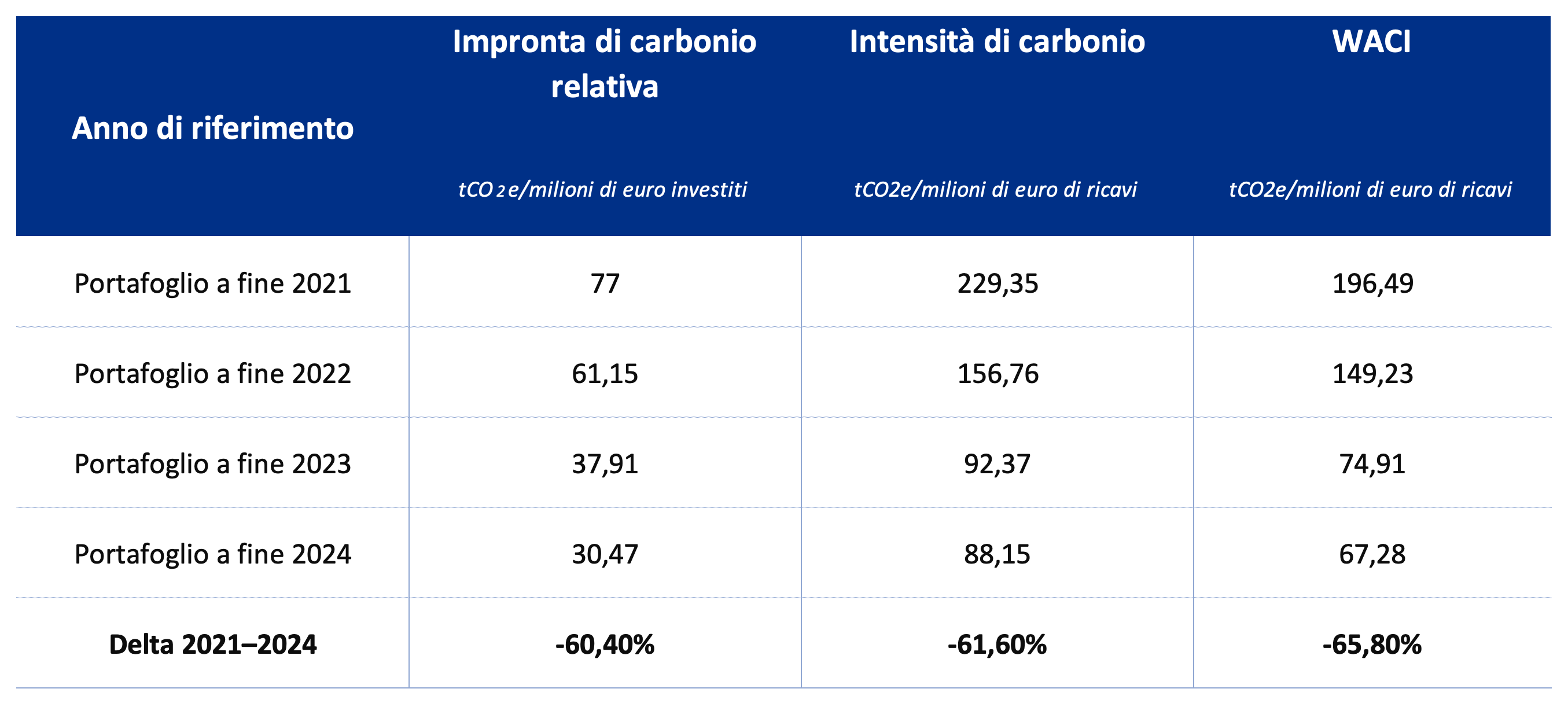 Inoltre l’intensità di carbonio del portafoglio alla fine del 2024 è inferiore a quella degli anni precedenti e diminuisce costantemente nel tempo.
