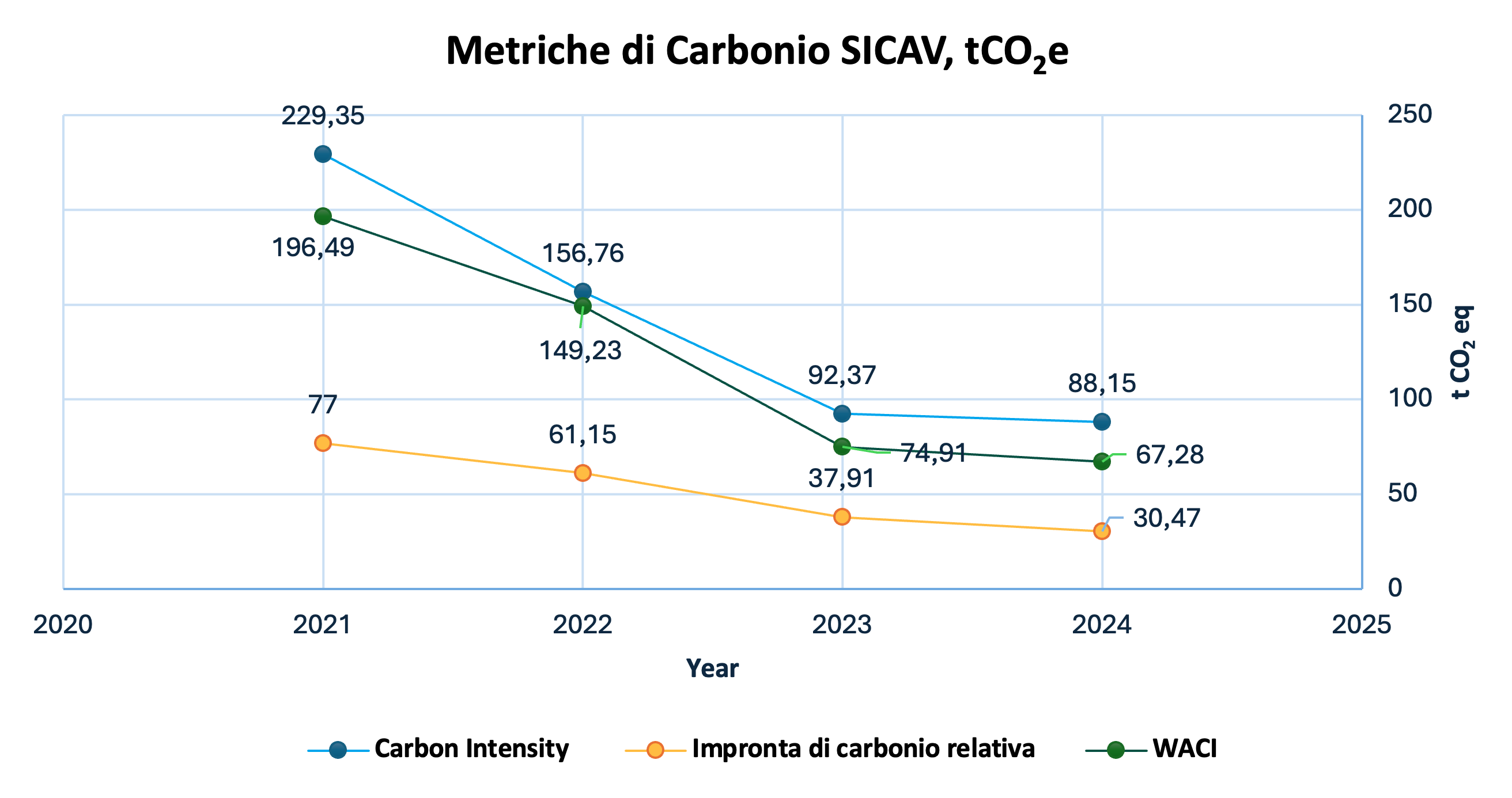 Tutte le metriche sono diminuite sostanzialmente dal 2021 al 2024, con una riduzione del 61% dell’intensità di carbonio.