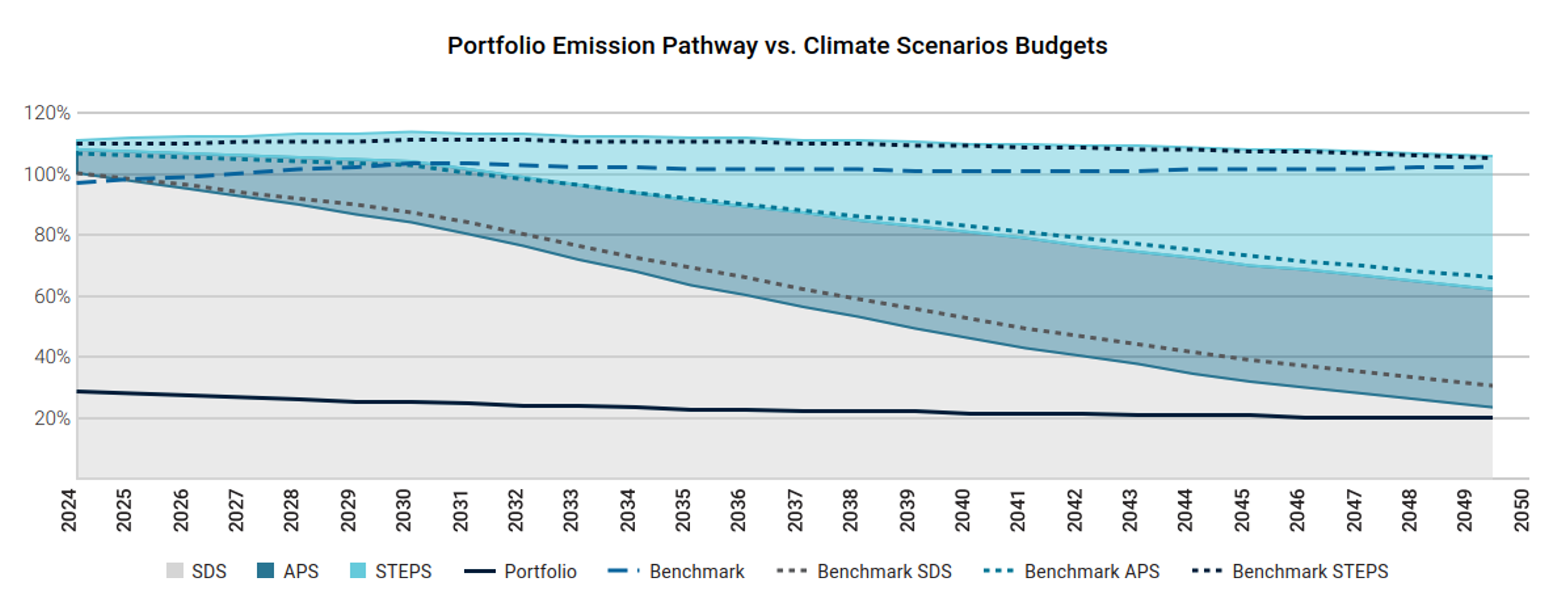 L’analisi illustra la performance climatica calcolata sul portafoglio alla fine del 2024 e la confronta con l’indice MSCI World ESG Universal Net Total Return (attuale MSCI World Universal Net Total Return) come benchmark di mercato (indicato anche come “il benchmark”) alla stessa data.