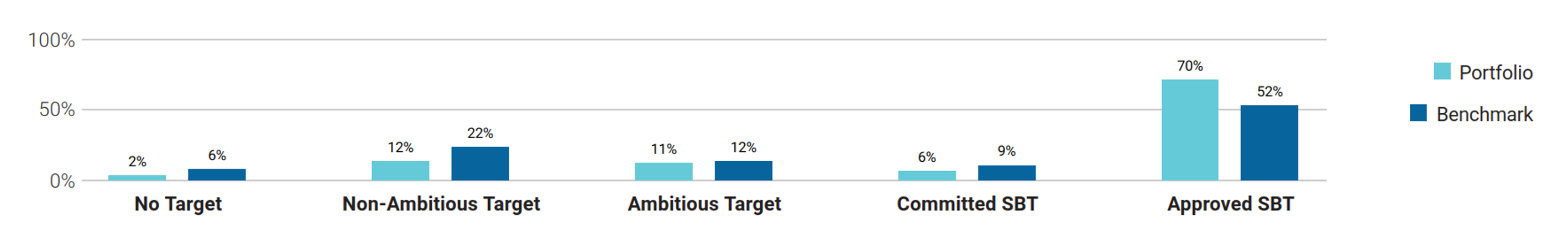 Al 31.12.2024, secondo ISS, l’87% del valore del portafoglio è impegnato a rispettare gli obiettivi climatici internazionali e a dimostrare i progressi futuri, contro il 73% del benchmark. In particolare, il 70% del valore del portafoglio è coperto da un obiettivo di riduzione dei gas serra approvato dall’iniziativa Science-Based Targets (SBTi), contro il 52% del benchmark. Rispetto all’analisi dello scorso anno del portafoglio alla fine del 2022, c’è un aumento del 7% nel numero di aziende coperte da un obbiettivo approvato dalla SBTi.