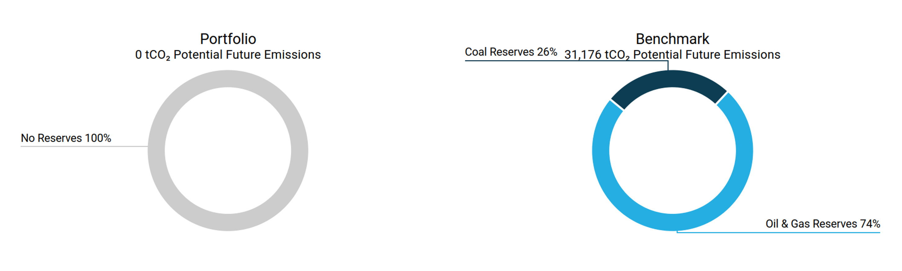 Non vi è alcuna esposizione ai combustibili fossili, né alcuna società possiede riserve di combustibili fossili. Ciò significa che la SICAV non ha emissioni potenziali future, mentre il benchmark è associato a 31.176 tCO₂ di emissioni future.