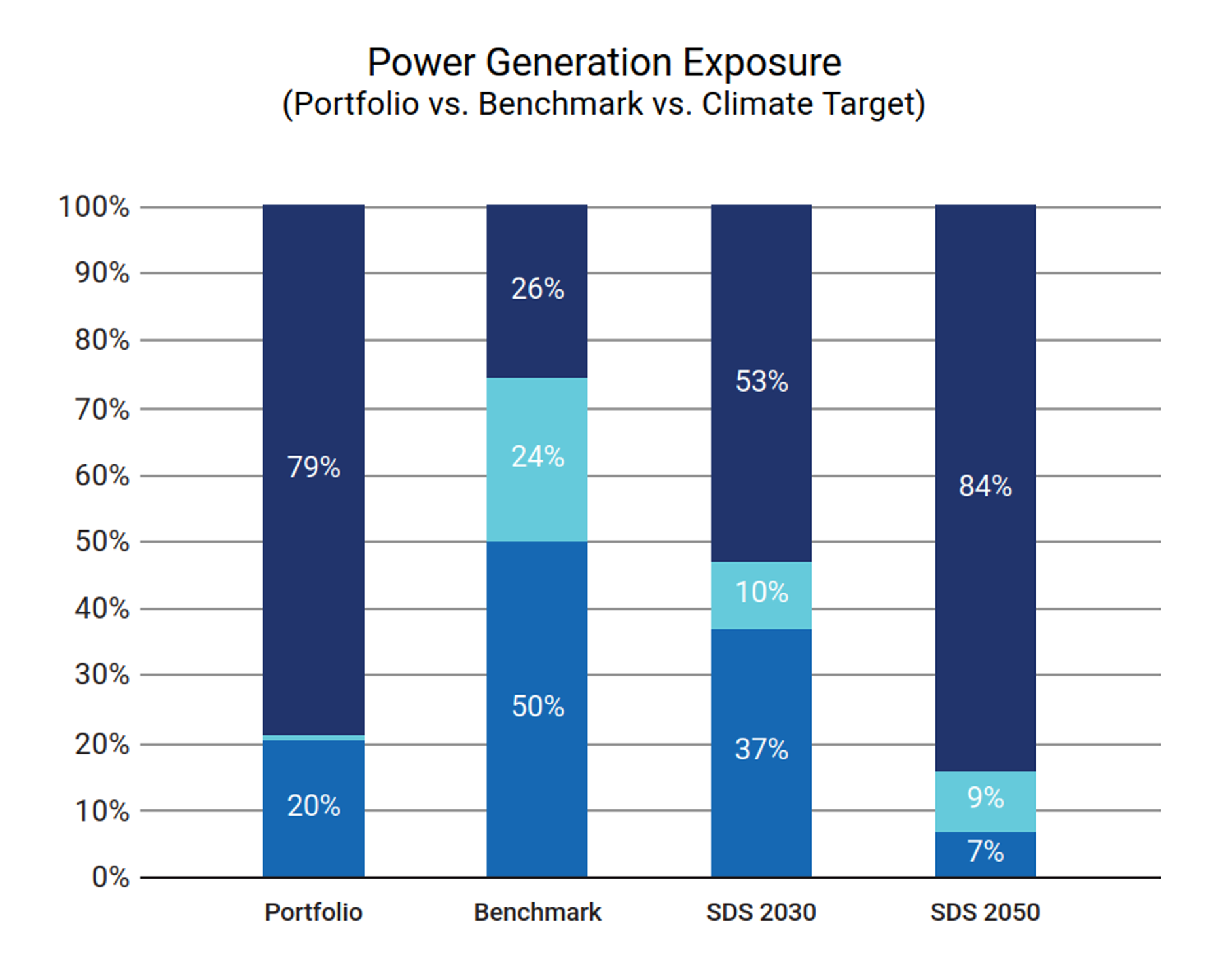 Inoltre, i livelli di rischio transitorio e fisico del portafoglio sono entrambi molto bassi e la percentuale di energia rinnovabile è più alta rispetto allo scenario di sviluppo sostenibile 2030 dell’IEA.