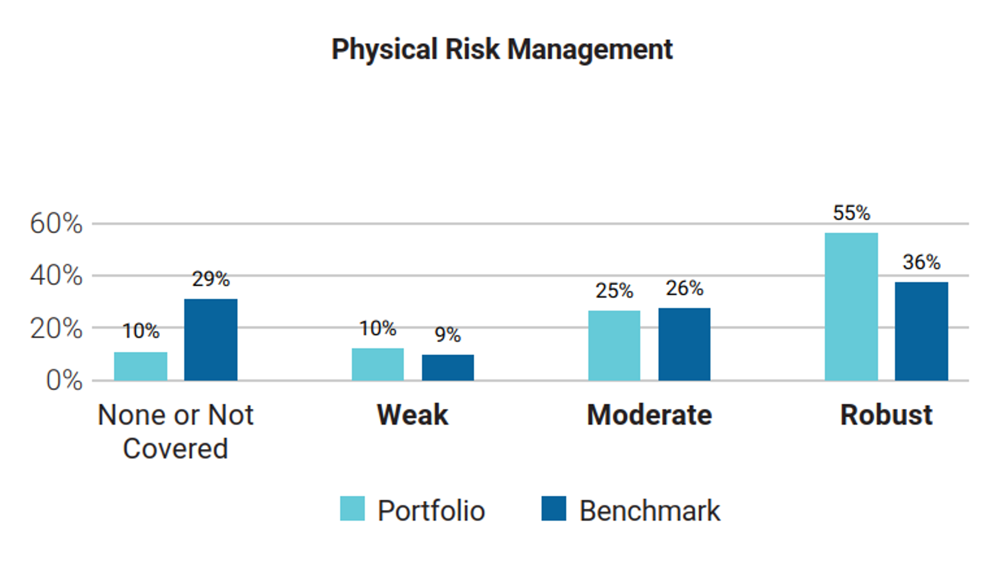Tuttavia, in base alla valutazione di ISS, solo il 10% (12% nell’analisi 2024) degli emittenti ha una strategia di gestione del rischio fisico debole e il 55% ha una strategia solida (53% nell’analisi 2024).