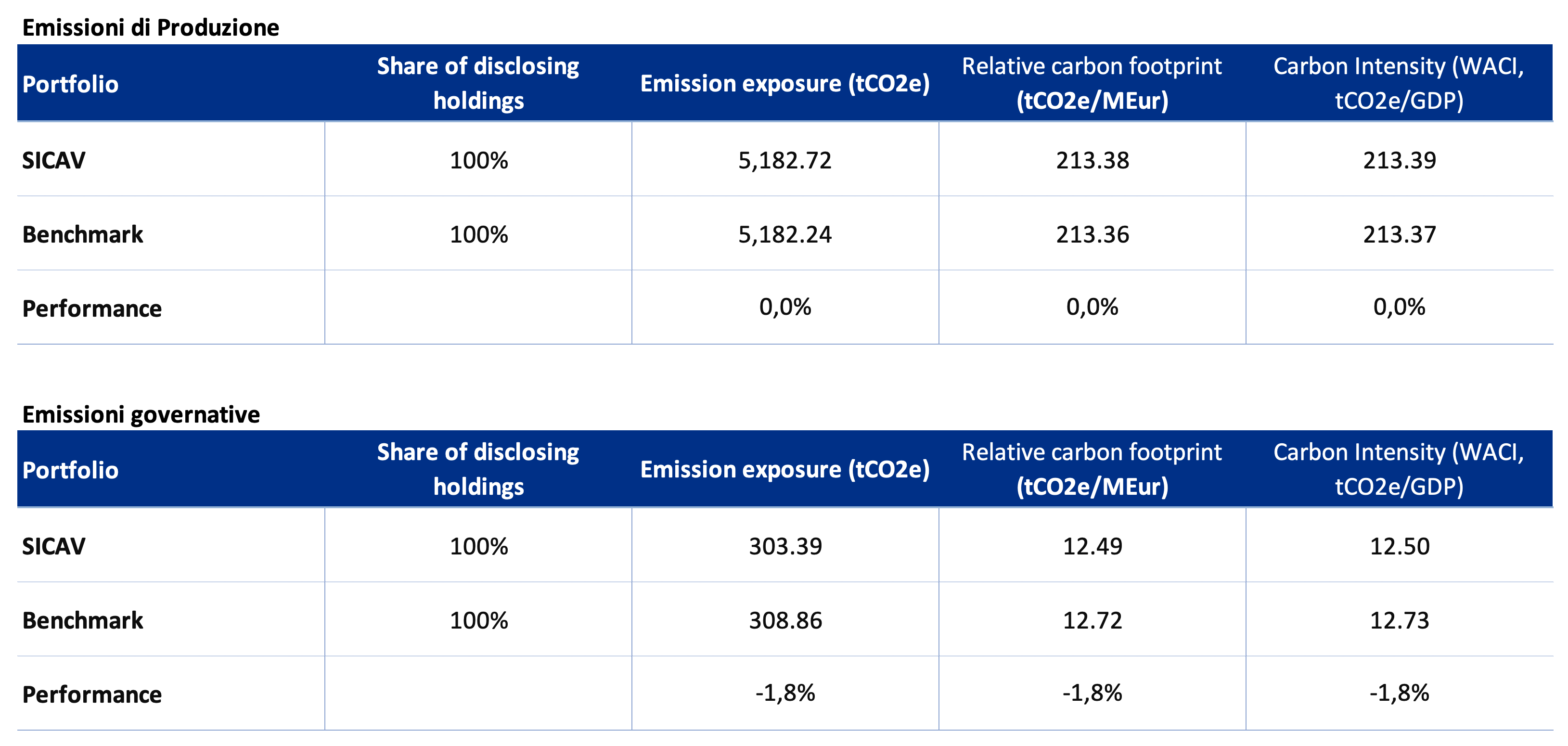 L’impronta di carbonio relativa del portafoglio ammonta a 30,47 tCO2e/milioni di euro. L’intensità di carbonio è di 88,15 tCO2e/milione di euro. L’intensità di carbonio media ponderata è di 67,28 tCO2e/milioni di euro.