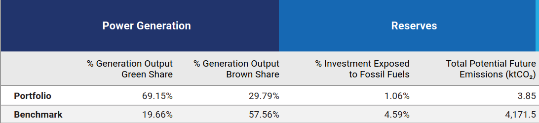 Il 69% della capacità installata di generazione di energia delle società del portafoglio proviene da fonti rinnovabili. Nel benchmark la quota di capacità di energia rinnovabile è di circa il 20%.