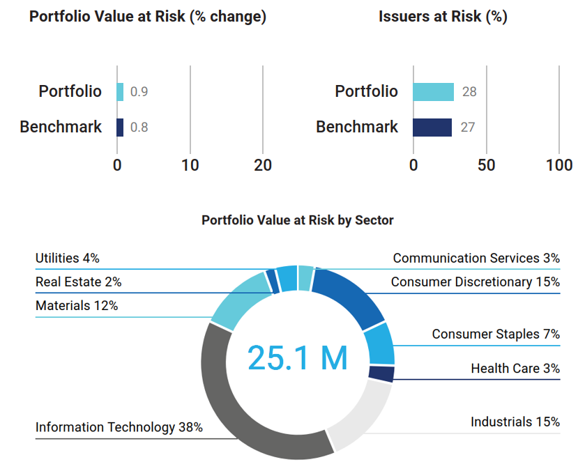 ISS utilizza un modello per stimare le potenziali perdite di valore, entro il 2050, derivanti dalla variazione del prezzo delle azioni a causa dei rischi fisici posti dal clima, calcolando il valore a rischio (VaR, Value at Risk) di ciascun emittente. Il modello di valutazione prende in considerazione i seguenti rischi: variazioni del valore del capitale attraverso variazioni delle proprietà, degli impianti e delle attrezzature (PP&E, Property, Plant and Equipment), costi di riparazione delle attività danneggiate attraverso investimenti in spese in conto capitale (CAPEX, Capital Expenditure), aumenti dei costi di produzione attraverso variazioni delle spese di vendita, generali e amministrative (SG&A, Selling, General and Administrative Expenses) o costo del venduto (COGS, Cost of Goods Sold), variazioni del reddito attraverso le vendite.