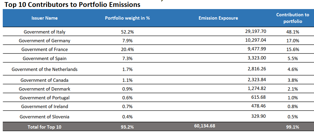 L’intensità delle emissioni per unità di output dell’Italia è superiore di circa il 36% a quella della Francia, del 38% a quella della Spagna e dell’11% a quella della Germania. Tuttavia, l’intensità delle emissione dell’Italia per unità di debito emesso diminuisce a circa il +16% rispetto alla Francia e il +18% rispetto alla Spagna, ma è inferiore del 133% rispetto alla Germania. In effetti, le emissioni assolute della Germania sono quasi il doppio di quelle dell’Italia, ma anche il suo PIL rettificato per la PPA è molto più alto di quello italiano, mentre i due Paesi presentano un ammontare di debito assoluto simile. Quindi, se il divario di emissioni tra Italia e Germania appare limitato quando è rapportato al PIL, emerge chiaramente quando è rapportato al debito. Si noti inoltre che il contributo della Germania all’esposizione alle emissioni del portafoglio è molto più elevato della sua ponderazione in portafoglio.