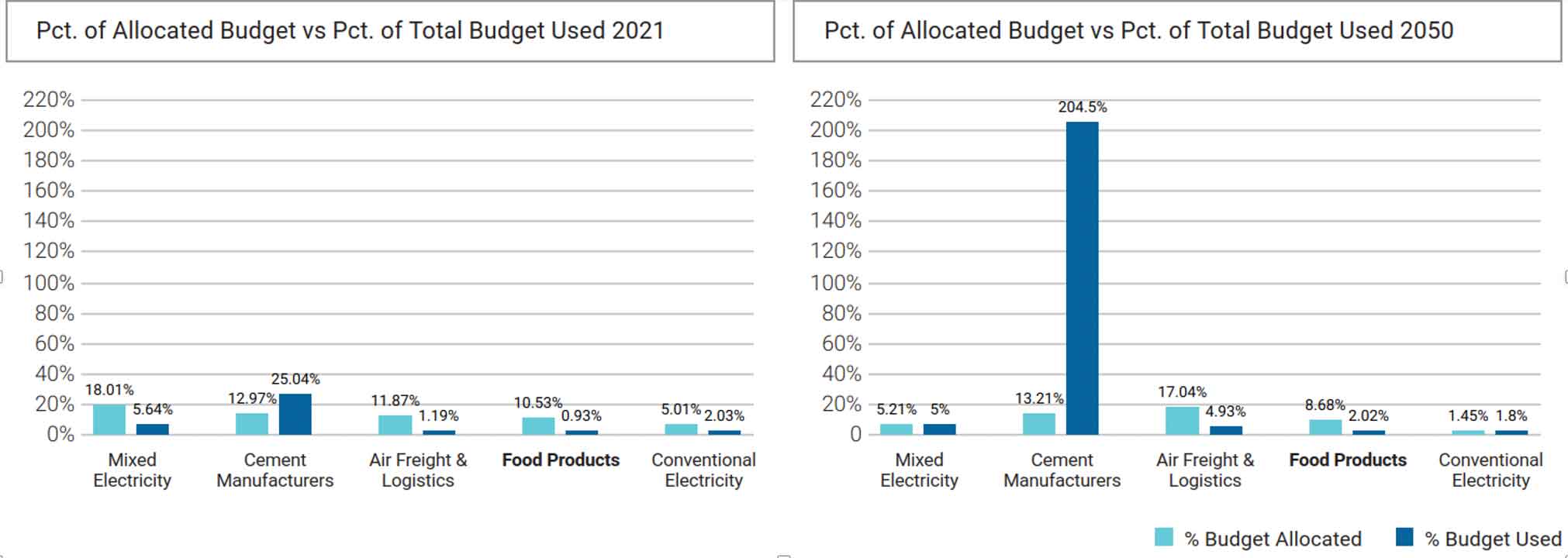 Si noti che il budget assegnato ai sottosettori varia tra il portafoglio e il benchmark perché dipende dalla quota di mercato prevista di ciascuna società e dalla sua impronta di carbonio stimata. Pertanto, una diversa allocazione settoriale a livello di portafoglio si traduce in un diverso budget di carbonio assegnato. In particolare, è consentito un budget più elevato per i settori che presentano il maggiore impatto sul clima.