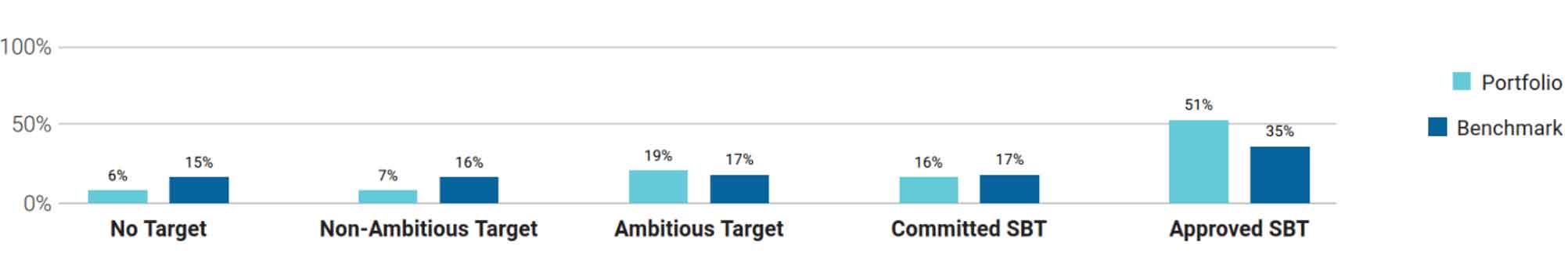Al 31.12.2021, l’86% del valore del portafoglio evidenzia un impegno a rispettare gli obiettivi climatici internazionali e mostra progressi futuri, rispetto al 67% del benchmark. In particolare, il 51% delle società in portafoglio ha fissato un obiettivo di riduzione dei gas serra approvato dalla Science-Based Targets initiative (SBTi), rispetto al 35% del benchmark.
