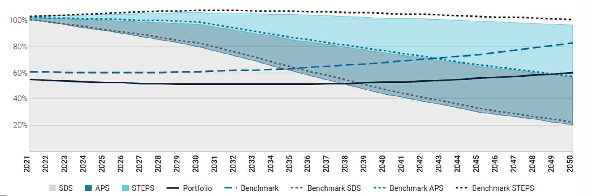 La performance è indicata quale percentuale del budget assegnato utilizzato. L’analisi mostra che il portafoglio rimane al di sotto del budget di carbonio associato allo Scenario delle politiche dichiarate (STEPS) e, fino al 2049, è al di sotto dello Scenario degli impegni annunciati (APS).