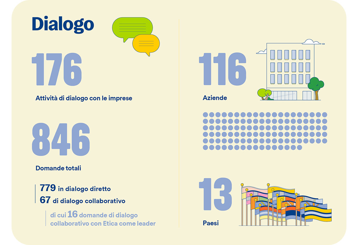 Abbiamo ulteriormente sviluppato l’attività nell’ambito della biodiversità, rafforzando la partnership con il programma CDP Forest Champions. Ciò ha portato Etica Sgr ad essere inserita nell’elenco di best practice internazionali della pubblicazione Nature positive for climate action di UNFCCC5. Forti degli stimoli ricevuti dalla nostra partecipazione al Tax Reference Group di PRI, abbiamo strutturato una campagna di dialogo sul tema della fiscalità che ci ha permesso a fine anno di identificare le società a più alto rischio sul tema. Da ultimo, abbiamo iniziato una campagna sull’uso responsabile dell’intelligenza artificiale, sottoscrivendo l’Investor statement on Ethical AI e partecipando ai lavori della Collective Impact Coalition for Ethical AI.