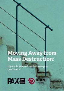 Il Rapporto 2023 di Don’t bank on the bomb si intitola “Moving Away from Mass Destruction: 109 exclusions of nuclear weapon producers” e mette in luce le 109 istituzioni finanziarie che hanno adottato politiche per escludere gli investimenti in aziende coinvolte nello sviluppo, produzione, test, manutenzione e stoccaggio di armi nucleari. Sono banche, fondi pensione, gestori di attività e altri attori del settore finanziario che dimostrano attivamente l’impegno per il disarmo nucleare. Rispetto al rapporto 2022, si sono aggiunte 11 nuove istituzioni.